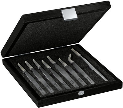 Assortiment de 8 brucelles B-NOX en acier inox, finition soignée, bonne duretée, en coffret bois